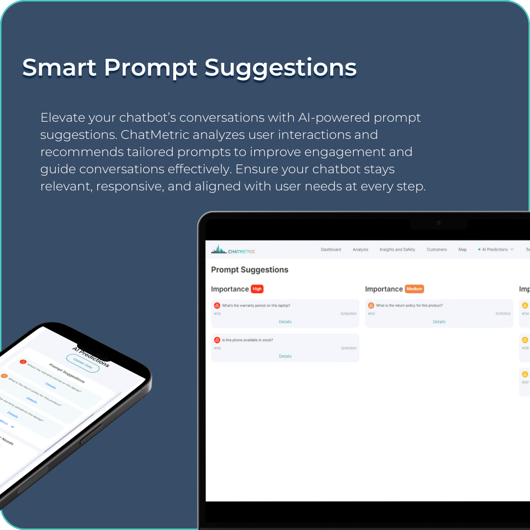 Enhance chatbot interactions with intelligent prompt suggestions powered by AI. ChatMetric analyzes conversations in real-time, offering optimized prompts that improve response quality and engagement. Keep your chatbot proactive, relevant, and customer-focused with every interaction.